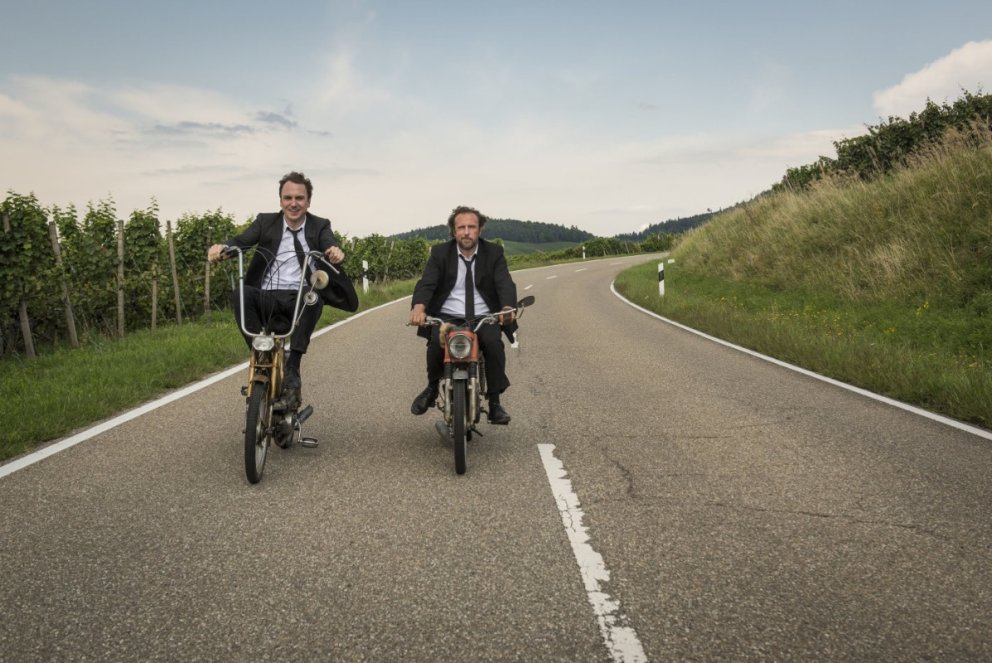 Das ist der Beginn einer alten, neuer Bruderschaft und Auftakt zu einem Roadmovie der beherzten und amüsanten Art. Die beiden, in die Jahre gekommenen Easy Rider auf Mofas haben Regeln für diesen Jugendtrip (nun im Alter) aufgestellt. Unter anderem verpflichten sich die Brüder, zu trinken, auf Drogentrip zu gehen, dem Sex zu frönen, die gesamte Speisekarte bei einem Griechen zu vertilgen, eine schlafende Kuh umzustossen und einen 20-Meter-Wheelie hangabwärts zu vollführen, das heisst auf einem Mopedrad zu fahren und am Hang einer Kiesgrube abzuspringen. Da kommt so einiges zusammen zwischen Höchingen, Badischer Weinstrasse, Paderborn, Berlin und Mecklenburg-Vorpommern. Der Schwof an einem Weinfest führt zum Clinch mit zwei knackigen Festladies (Alexandra Maria Lara und Franka Potente) inklusive Steppeinlage, die beiden Moped-Helden haben ein Techtelmechtel mit einer Polizeistreife wegen «Erregung öffentlichen Ärgernisses», bei einen Tischtennis-Fight mit dem Camping-Rowdie «Hantel» (Wotan Wilke Möhring) spielen sie sich um Kopf und Mofas. Beim «Wurzelfest» (Back to the Roots) wird’s tiefgründig. Georg erfährt, dass Bruderherz Christian einen 15jährigenSohn in Berlin hat. Da gibt’s kein Halten: Georg besteht auf Kontaktaufnahme und sei es nur beim Fussball…