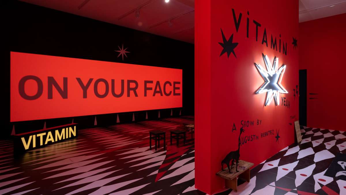 Als Augustin Rebetez 2011 seine erste Einzelpräsentation im Rahmen der Caravan-Reihe für junge Kunst im Aargauer Kunsthaus durchführt, ist er erst 25 Jahre alt und hat gerade die Fotoklasse abgeschlossen. In seiner raumgreifenden Wandinstallation zeigt sich bereits damals, dass ihm der Bildraum nicht genügt. «HEY, YOU, COME CHECK MY STUFF! PLEASE, LOOK AT ME! COME ON! SEE ME NOW!»– beinahe aufdringlich fordert Rebetez’ neuste Videoarbeit die Aufmerksamkeit der Besuchenden im Aargauer Kunsthaus ein. Das Werk Vitamin (2023) ist schrill, bunt und hinterlässt uns aufgedreht und voller Neugier, mehr über diesen pulsierenden Kosmos zu erfahren. Vitamin verdeutlicht aber gleich zu Beginn der gleichnamigen Ausstellung: Es kann laut und unbequem werden. Augustin Rebetez ist das recht. Er hat keine Angst davor, sein Publikum herauszufordern, und bekämpft gerne Feuer mit Feuer. So wird es im grauen Winter plötzlich wohlig warm–Rebetez’ Werke spenden Energie und lassen seine Freude aufblitzen, die Überforderungen und Widersprüche des modernen Lebens zu einem Sinnesgewitter
