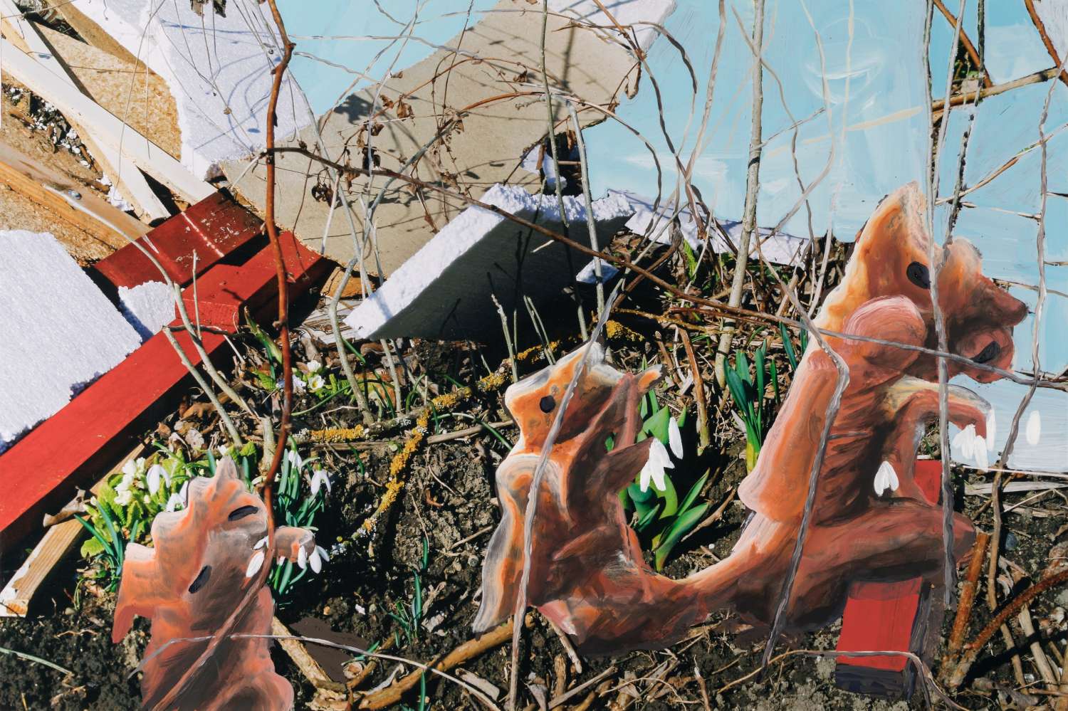 «Was wäre wenn?» präsentiert drei Spiele, die Architektur als aktiven Teil der Erzählung nutzen, um spekulative Zukunftsvisionen erfahrbar zu machen. Auch das Künstlerduo Lutz & Guggisberg lässt in seinen installativen Arbeiten aus Alltagsmaterialien scheinbar unvereinbare Welten verschmelzen – und das ganz analog. Als Meister der spekulativen Kunst erreichen ihre Werke mit erfrischender Leichtigkeit oft philosophische Tiefen. Mit «Giardini di domani» zeigen sie eine Serie von Fotografien zerstörter Stadtgärten, in denen trotz der Verwüstung Pflanzen, Früchte und Blumen gedeihen. Martina Morger reinigt im Rahmen ihrer Performance-Serie «Cleaning Her» seit 2018 vernachlässigte Skulpturen von Künstlerinnen im öffentlichen Raum und thematisiert dabei Ungleichheiten in Sichtbarkeit und Repräsentation. Für die Ausstellung entwickelt sie die neue Arbeit «Cleaning Her» Bern, die individuelle Care-Handlungen mit kollektiver Verantwortung verbindet und zum Nachdenken über die eigene Rolle in der Gesellschaft anregt. Die Performance findet am Samstag, 29. November 2025, um 15 Uhr in der Stadt Bern statt.