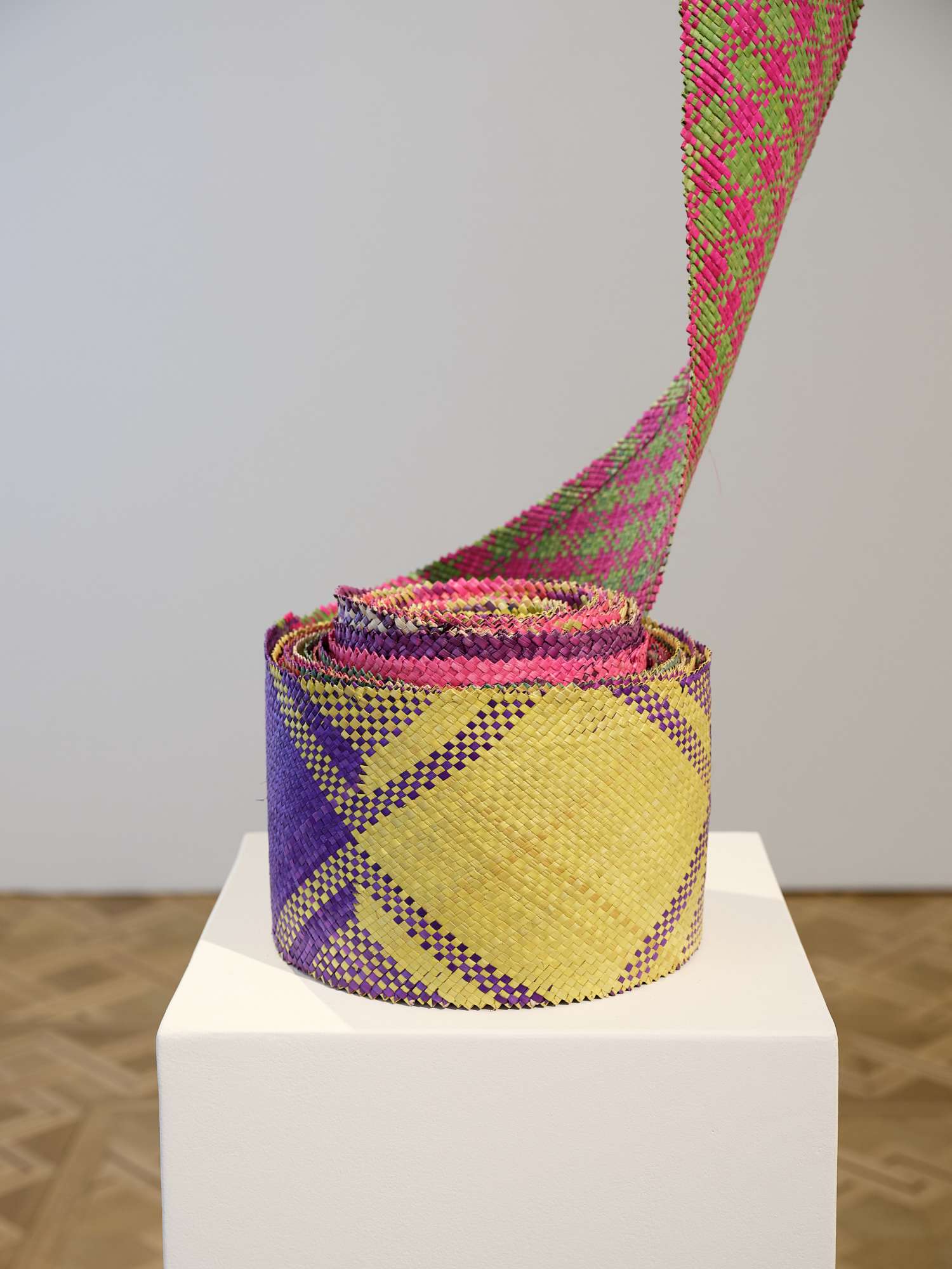 Gehen und immer weiter gehen, ohne klares Ziel vor Augen – so in etwa lässt sich MANSAU-ANSAU aus der Sprache der indigenen Stämme Kadazan und Dusun in Yee I-Lanns Heimat Sabah, Malaysia, übersetzen. Der Gedanke an diesen Gang ins Unbekannte kann einerseits verängstigen, besteht doch stets das Risiko, sich zu verirren. Genau gleich gross ist aber auch die Chance, Neues zu entdecken. In der Wanderausstellung, die von Dezember 2024 bis März 2025 im Singapore Art Museum (SAM) in Singapur zu sehen war, geht es vor allem darum, Themen wie Kunst und Kolonialismus aus neuen Blickwinkeln zu betrachten. Herzstück der Ausstellung MANSAU-ANSAU ist die aus Bambus geflochtene Matte als Grundlage zum Versammeln und Zusammensitzen. Sie symbolisiert einen Raum für Intimität und bietet in der Betrachtungsweise der Künstlerin eine Plattform für das Lokale, Demokratische, Feministische und die soziale Gleichheit. «Die Matte ist ein Ort zum Geschichtenerzählen und ein Weg, um neues Wissen zu entdecken», so I-Lann.