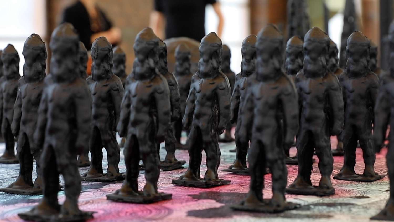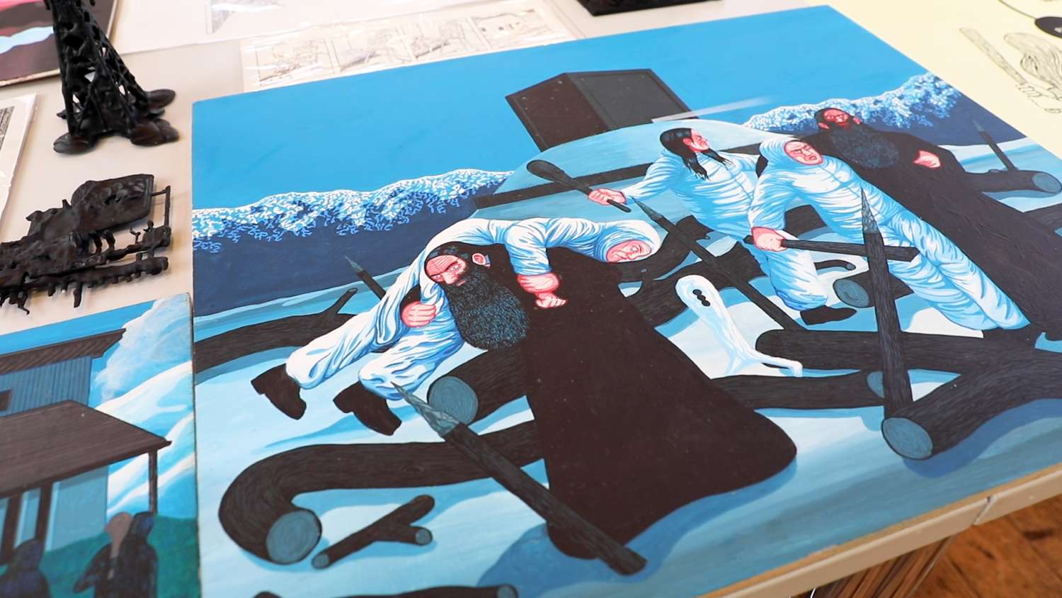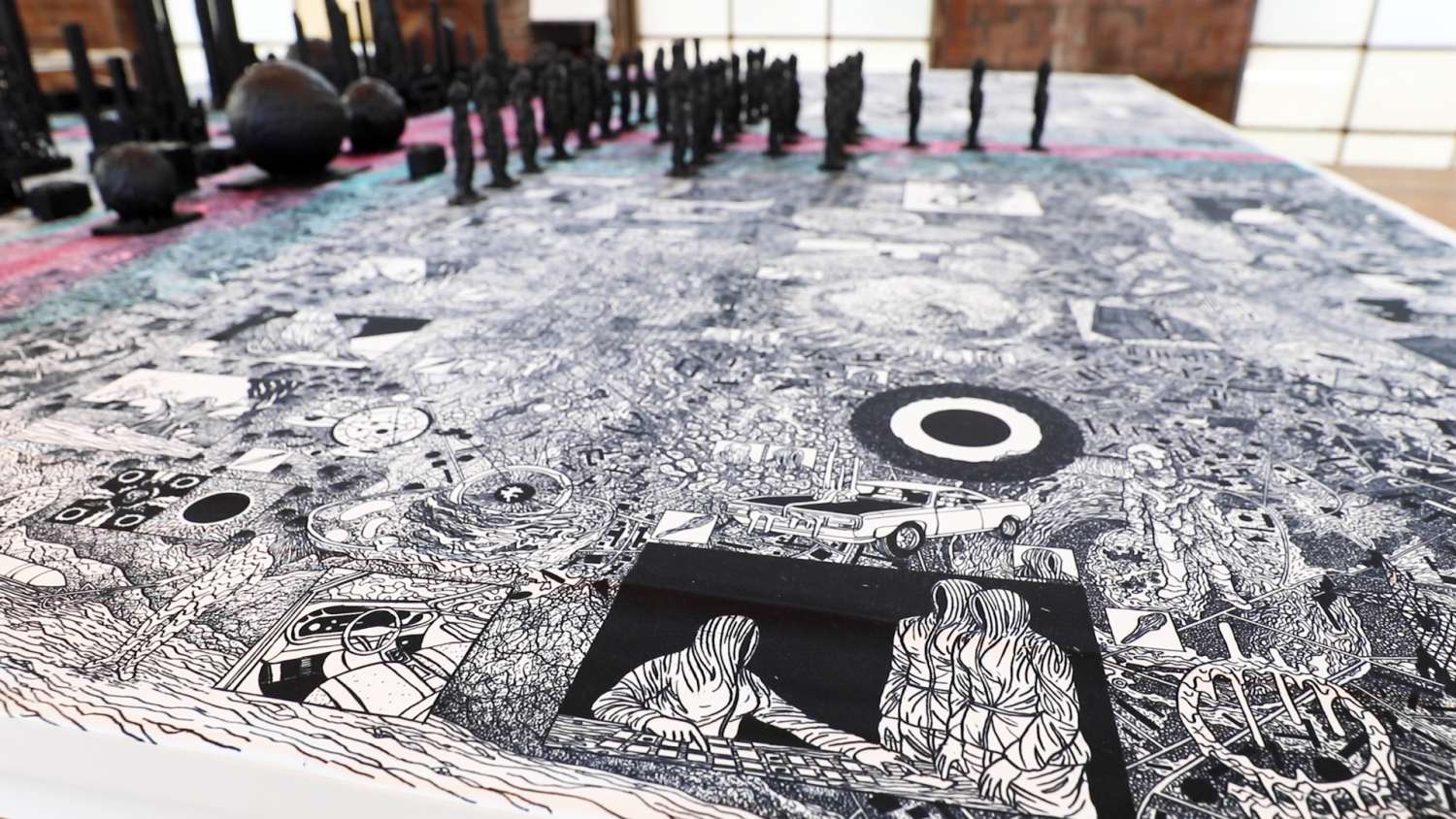 Seit über 40 Jahren entfaltet der Genfer Zeichner Helge Reumann (*1966) ein Universum mit einer starken grafischen Sprache, bissigem Humor und einer rigorosen Ästhetik, angesiedelt zwischen Comic und zeitgenössischer Kunst. Die raumgreifende Installation «Chöd» gibt einen Einblick in diese Arbeit, die sich den klassischen Comic-Strukturen entzieht.