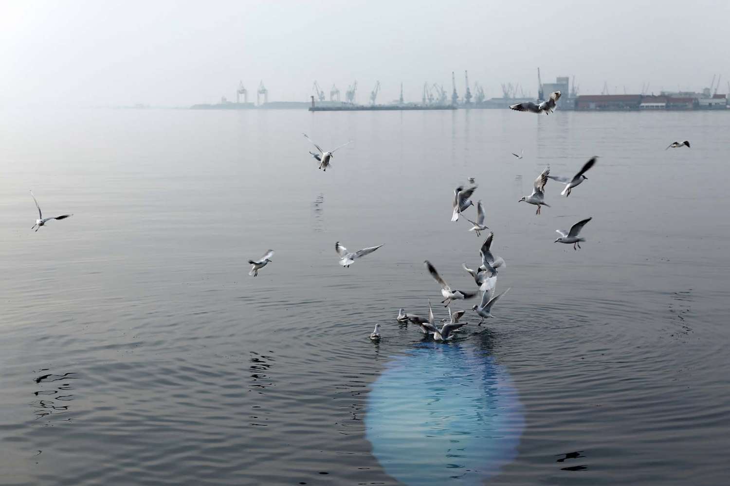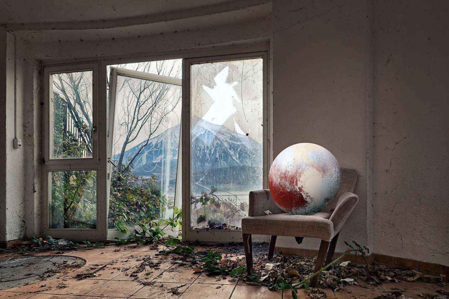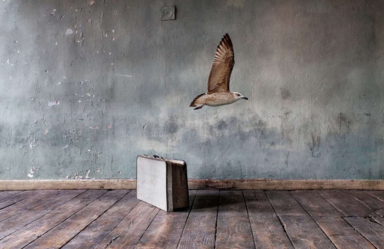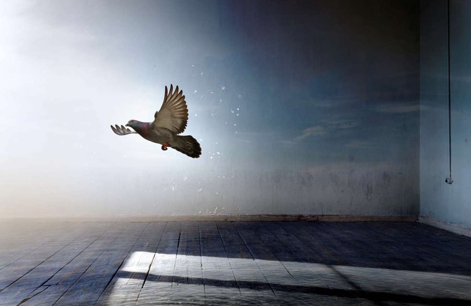 Eva Borners fotografische Montagen im Aargauer Kulturraum Mokka-Rubin offenbaren den Betrachtenden ungewohnte und auf den zweiten Blick manchmal auch etwas beunruhigende Welten. Die Fotomontage-Serie «Flugräume» (2020) etwa zeigt scheinbar traumverhangene, etwas melancholische Szenerien, die in einer verlassenen Herberge in Thessaloniki aufgenommen wurden und die erst bei näherer Betrachtung eine zweite Ebene offenbaren, wenn man sich gewahr wird, dass sich hier die Räume – ähnlich wie in den Zeichnungen von M.C. Escher – paradox und unauflöslich ineinander verflechten: Das Innen ruht im Aussen, während das Aussen wiederum die Innenräume kapert, in Bewegung bringt und auflöst: So weicht sich der Boden (oder ist es ein blauer Teppich?) eines spärlich mit einem Sofa ausgestatteten Zimmers unter unserem Blick sanft in Meereswellen auf, oder eine Taube bricht gegen den sonnigen Horizont einer rauen Zimmerwand auf.