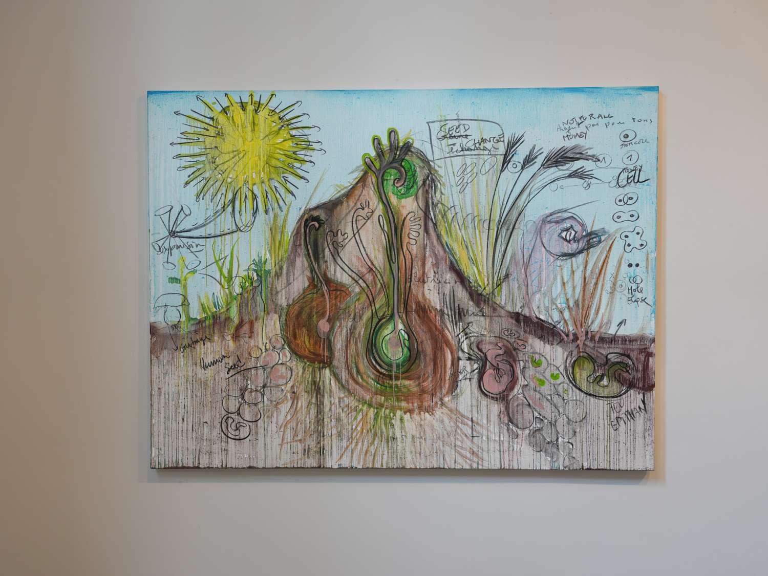Fabrice Hybers Werke sind keine abgeschlossenen Objekte, sondern Teile eines offenen Denk- und Wachstumssystems. Seine Bilder wirken wie lebendige Diagramme: organische Formen, Wörter, Pfeile, Pflanzen, Körperfragmente — alles scheint miteinander verbunden, als würde sich ein riesiges neuronales Netz über die Leinwände spannen. Der Künstler versteht Kunst als Prozess, nicht als Produkt. Ideen sollen sich vermehren, verändern und weiterwirken — ähnlich wie biologische Organismen. Dabei verschwimmen die Grenzen zwischen Kunst, Wissenschaft und Alltag bewusst. Hyber entwirft Modelle für eine Welt, in der Kreativität nicht Dekoration, sondern Überlebensstrategie ist. Seine Arbeiten laden dazu ein, Zusammenhänge neu zu denken: zwischen Mensch und Natur, Individuum und Gesellschaft, Gegenwart und Zukunft. In einer Zeit, die von Beschleunigung und Krisen geprägt ist, setzt er auf Komplexität statt Vereinfachung — und auf Imagination als politische Kraft.