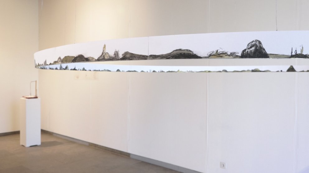 In der Ausstellung werden Parallelen aus verschiedenen malerischen Perspektiven und in Bezug auf die Bergbegehungen von damals zu heute gestellt. Als Pionier der europäischen Landschaftsmalerei des 18. Jahrhunderts gilt Caspar Wolf (1735-1783). Als einer der Ersten überhaupt malte der aus Muri stammende Künstler vor 250 Jahren die Welt der Alpen genau so, wie er sie mit eigenen Augen sah. Ausschnitte aus dem Film «Reisen im fast unbekannten Gebürg», der für das Museum Caspar Wolf in Muri produziert wurde, veranschaulicht die Bergketten und Panoramen von damals bis heute. Durch die Gegenüberstellung der Sicht des Malers auf die heutigen Horizonte der Gletscherregionen werden die starken Veränderungen in Bezug auf die Gletschersituation und deren Schmelzprozess deutlich. Die beiden Künstlerinnen Esther Amrein (1968) und Rosângela de Andrade Boss (1966) untersuchen in gemeinsamen Arbeiten immer wieder die Beziehungen zwischen materiellen und immateriellen Systemen. Das Duo wurde immer wieder durch die Vorgehensweise des Malers Caspar Wolf inspiriert, sowohl durch seinen Blick auf die landschaftliche Wahrnehmung, als auch die starken Kontrastdarstellungen zwischen dunkel und hell. Neben dem grossen Gemeinschaftswerk «Cortina» ist die Künstlerin Esther Amrein mit weiteren raumgreifenden Arbeiten vertreten. Es ist immer der Standpunkt, der den Blick und somit den Horizont bestimmt. Amrein verbindet Einzelteile eines fiktiven Horizontes zu einer langen Linie, die sie im Laufe der Ausstellung mehrmals umbaut, ergänzt und verändert. Agnes Meyer-Brandis (1973) verlässt die Erde über den Grat des Horizontes auf der Brücke der Wissenschaft und Phantasie. Ihre Interessen gelten der «Erforschung der Welt und ihrer Realitäten durch den Einsatz von erweiterten fantastischen Realitätsanwendungen», wie sie selbst schreibt. Am komplexen Projekt «Moon Goose Experiment» arbeitet die multimediale Künstlerin seit 2008. Das Werk ist inspiriert von der fantastischen Erzählung «Man in the Moone» von Frances Goodwin aus dem 17. Jahrhundert. In dieser beschreibt Goodwin eine abenteuerliche Reise zum Mond mit einem von Gänsen gezogenen Gefährt und schildert dabei sehr eindrücklich die Effekte der Schwerelosigkeit.