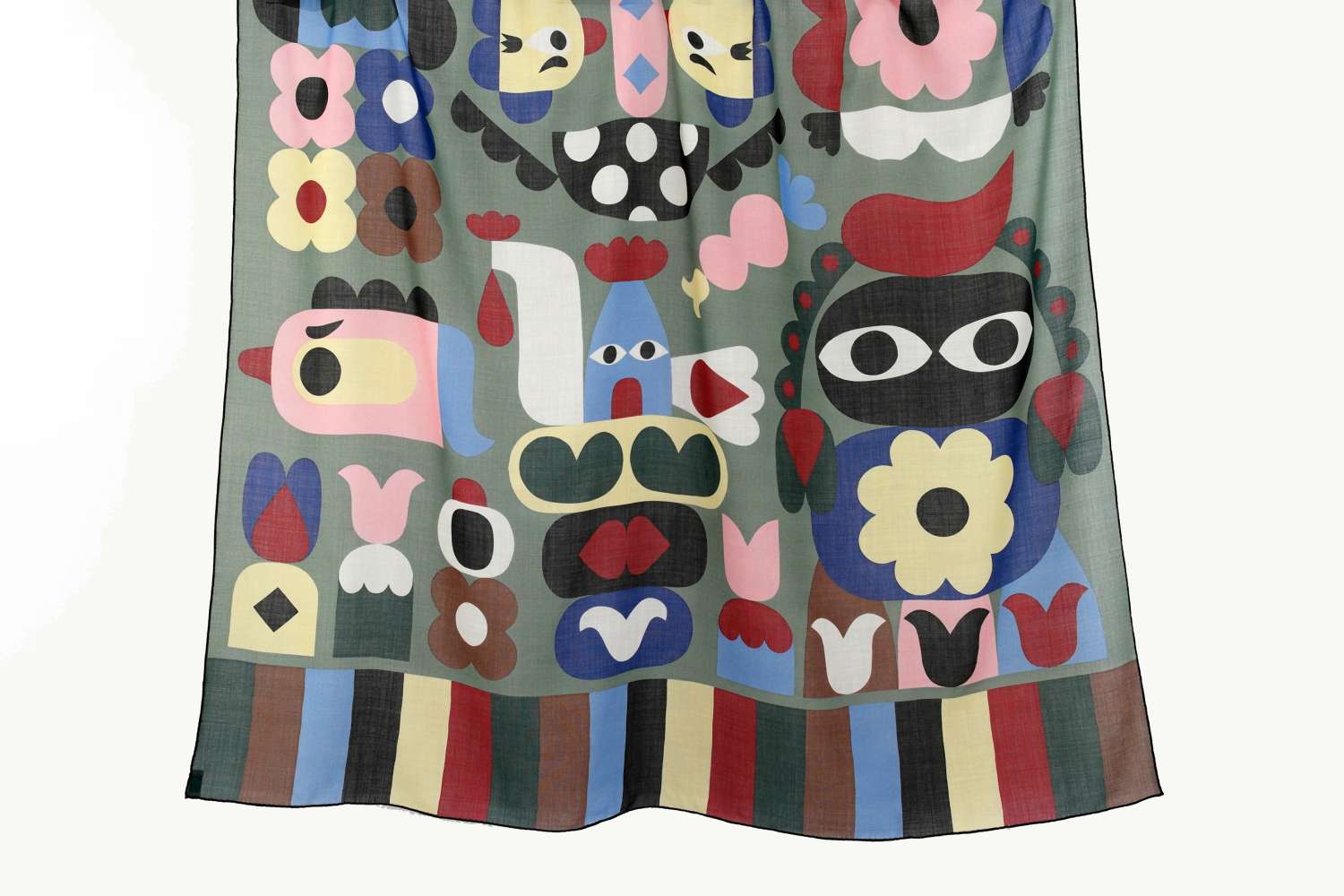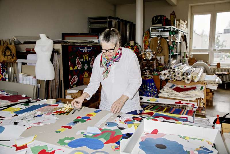 Ihre charakteristischen Foulards waren schon immer Bildkreationen. Daraus werden seit ein paar Jahren auch Raumbilder. Diese Erweiterung des künstlerischen Repertoires gründet auch auf der engen Zusammenarbeit mit dem renommierten New Yorker Textilunternehmen Maharam und den Schweizer BUR-Architekten. Beweglich und in spontanen Kombinationen überträgt sie ihre narrative Motivik von der einen in die andere Dimension und kreiert aus ihrer unverkennbaren, beständigen Bildsprache immer wieder Neues. Diese additive Vorgehensweise ist der Kern ihrer künstlerischen Handschrift, die zugleich auf eine einfache, «unverbildete» Art des Verzierens verweist, in der sich ein urmenschliches Bedürfnis nach Schönheit ausdrückt. Die Ausstellung «Gib Stoff!» zeigt diesen Textilkosmos, der für den Körper ebenso wie für den Raum geschaffen ist, präsentiert aber auch Inspirationsquellen und Arbeitsprozesse. So wird im Gewerbemuseum Winterthur die verfeinerte, vielseitige Handarbeit wie auch das grossartige Formenspiel aufgezeigt.