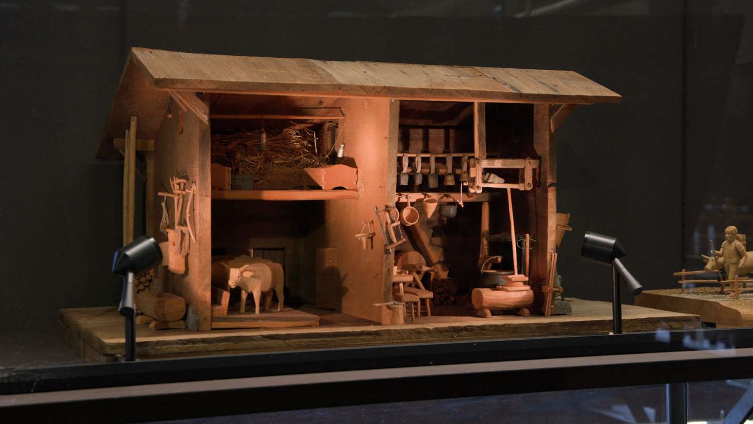 28 detailliert ausgearbeitete Miniaturmodelle geben Einblick in den vergangenen ländlichen Alltag. So schauen wir beispielsweise dem Wagner bei der Fertigung eines Rades zu und beobachten, wie im Anschluss der Schmied die Eisenreifen aufzieht. Wir stellen uns die trapazen der winterlichen Holzfuhren vor und freuen uns mit den Beteiligten auf das Festmahl nach der Hausmetzgete.