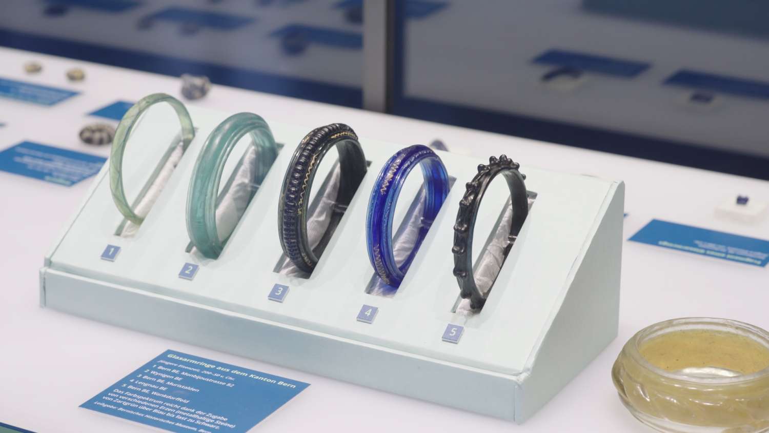 Die Geschichte des Glases beginnt im Nahen Osten und in Ägypten, wo bei der Metallverarbeitung zufällig glasähnliche Stoffe entstanden. Früh werden daraus Schmuck, Gefässe und Wandkacheln gefertigt. Auch die ältesten Zuger Funde bestehen aus einer frühen Glasart, der Quarzkeramik: Schmuckperlen, die vor rund 3500 Jahren in die Pfahlbausiedlung Cham-Bachgraben gelangen. In der Bronzezeit folgen blau-weisse Glasperlen aus norditalienischen Werkstätten, kombiniert mit Bernstein von der Ostsee. Prächtige Armringe der Eisenzeit – farbstark und handwerklich bis heute rätselhaft – zeigen das exzellente Können der Glasherstellung. Einen Höhepunkt markiert die römische Epoche: Die Erfindung des Glasblasens macht Glasgefässe für viele erschwinglich, gleichzeitig entstehen Luxusobjekte mit kunstvollen Verzierungen. Herausragende Becher, Spielsteine und kostbare Grabbeigaben aus der Schweiz und aus dem Rheinland dokumentieren Vielfalt, Technik und Status des Glases in jener Zeit.