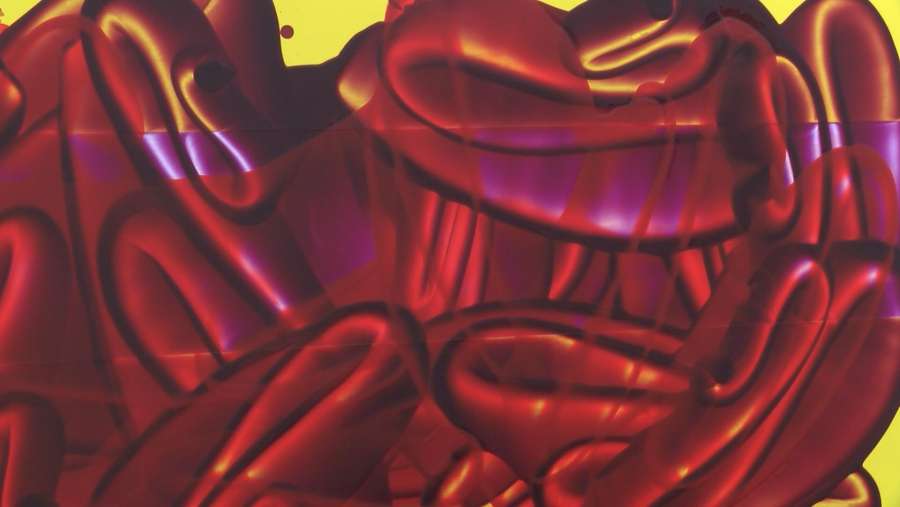 Gewaltige gestische Bewegungen, die sich wie Schlaufen oder Bänder über das Format bewegen und durch scheinbar zufällig angeordnete Farbfelder durchbrochen werden. David Reed in der Galerie Häusler Contemporary | Zürich