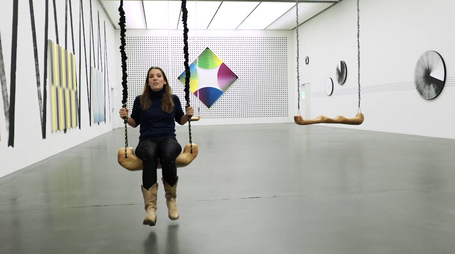 Steht man vor oder in ihren überbordenden Installationen, verführerisch polierten Skulpturen und perfekten Farbverläufen, sind Schwindel oder Augenflimmern keine Seltenheit. Die bemalten Museumswände kombiniert Claudia Comte (*1983) im Kunstmuseum Luzern mit einer neuen Serie von Gemälden in der Form von Kreisen, Halb- und Viertelkreisen sowie Dreiecken. Für ihr Schaffen ist das Handwerk zentral. Die in Berlin und Grancy VD lebende Künstlerin sägt, schleift, fräst, poliert, und immer ist ihr aussergewöhnlicher Elan spürbar. Mit grosser Ausdauer und Beharrlichkeit widmet sich Claudia Comte der Produktion ihrer Werke, steht tagelang mit der Motorsäge im Wald, um Baumstämme in die gewünschte Form zu bringen und anschliessend die Oberfläche glatt zu schleifen. Für ihre Einzelausstellung im Kunstmuseum Luzern verbindet Claudia Comte Skulptur, Gemälde und Wandmalerei zu raumgreifenden Installationen. Mit Humor und Intelligenz realisiert die Künstlerin einen schwindelerregenden Parcours, der mit überdimensionierten Schaukeln beginnt und mit einem Lächeln auf unseren Lippen endet.